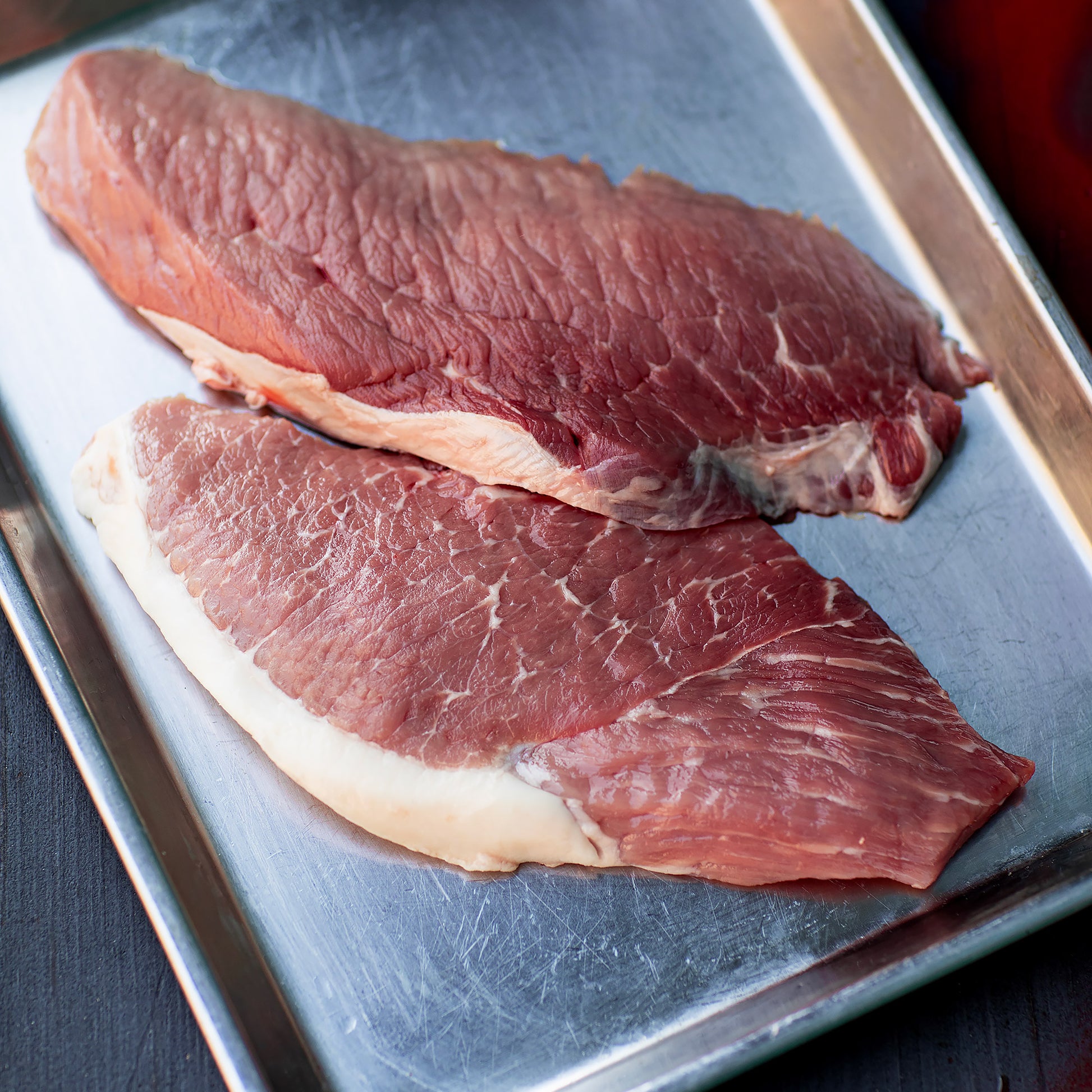 Slices of leg for cutlets from a Přeštice pig raised on pasture in an organic regime at the Sasov Biofarm.